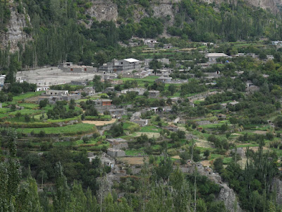 Karimabad in dolina reke Hunze, v ozadju pa Rakaposhi. Tukaj bi lahko letela, če bi prispela kakšen mesec prej. Silvester pravi ('polet mimo gore', youtube), da v lepem vremenu po dolinah sploh ne piha veter. Pa še res je bilo.